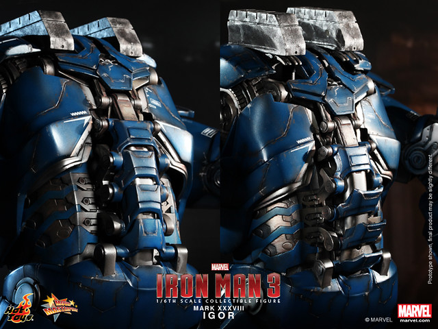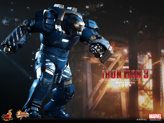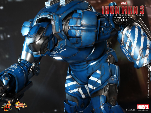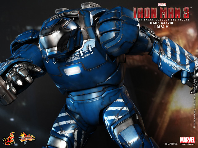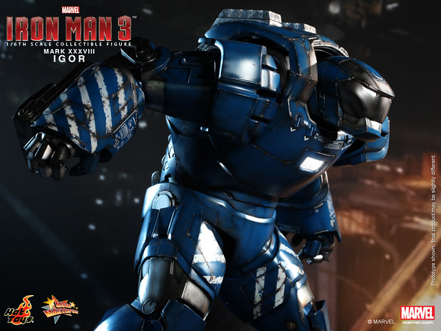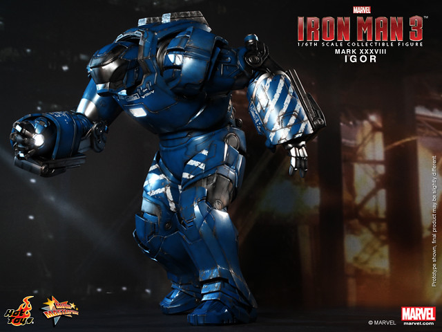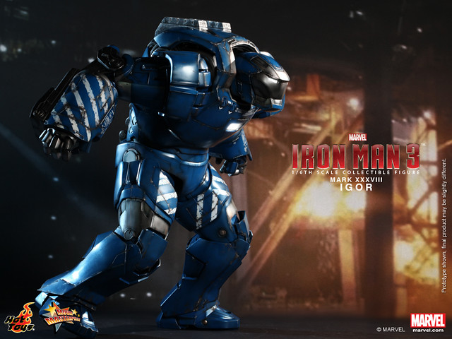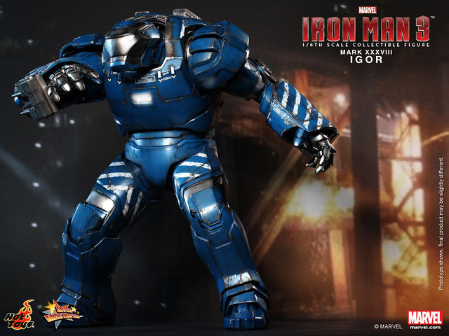 Hot Toys 今日宣布發行“鋼鐵人3”中登場的鋼鐵人 馬克38 - 負重裝甲“伊格爾” (Igor Mark XXXVIII),它在東尼命令老賈發動“家庭狂歡派對協定”(House Party Protocol)時登場。機體的名字出自於經典恐怖片“科學怪人”(Frankenstein)中,Henry Frankenstein 的駝背助手。