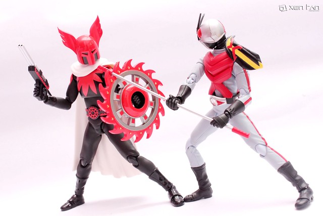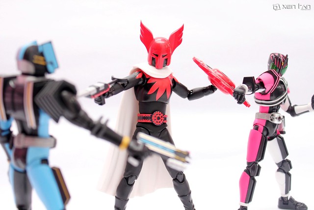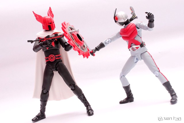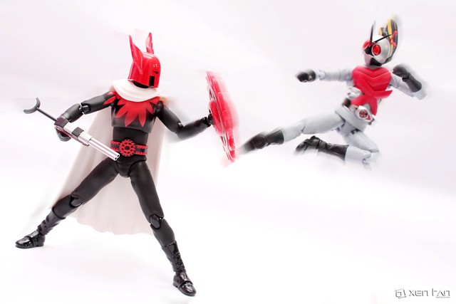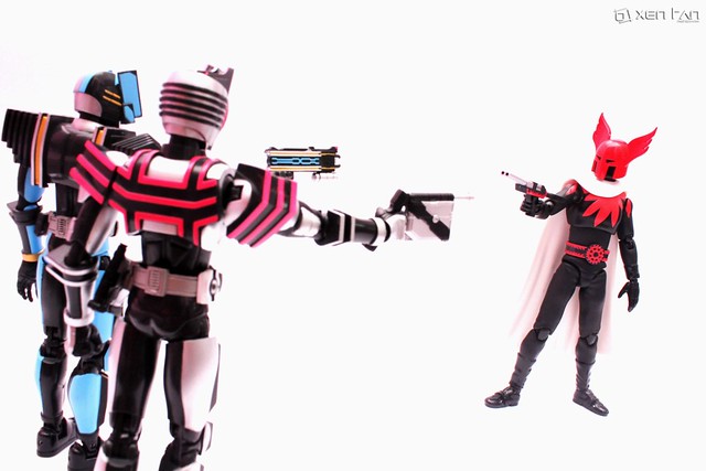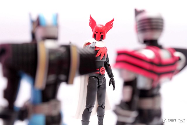 APOLLO GEIST登場~整體還不錯~但就是感覺頭大了一點~因為APOLLO不像騎士那樣有盔甲~只有個頭盔所以乍看之下頭有點點大~如果有仔細觀察~會發現APOLLO的手腳部位是另外上色的,不想SHOCKER兵仔那樣,是一種色系~APOLLO GEIST的手腳是光亮的~難道這就是限定品的不同~~:p