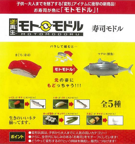 玩具新聞 BANDAI 日系 轉蛋&扭蛋 Bandai 逆再生壽司 轉蛋 奶油隊長 2013-12-19 22:00:43 分享 ✕ 分享 已複製網址 分享到 Facebook 分享到 LINE 分享到 Reddit 分享到 Twitter 分享到 Plurk 分享到微博 日Bandai萬代玩具公司的轉蛋商品事業部預計2014年1月推出逆再生 壽司轉蛋,將平常食用的壽司可以“逆轉”變成原來的模樣,像是鮪魚壽司可以 “逆再生”逆轉變成鮪魚,鮭魚卵壽司可以逆轉變成鮭魚,玉子燒壽司可以逆轉變成雞蛋等等,約有鮪魚壽司、鮭魚卵壽司、花枝壽司、小黃瓜捲壽司和玉子燒壽司五種類,單轉約200日幣,提供給喜歡有趣轉蛋商品的玩具人參考。 2013年12月19新增官網宣傳短片和照片。 奶油隊長 沈迷收集玩具、嗜好設計玩具、熱愛視覺圖像的思考模式,同時也超愛吃各種口味的美式漢堡,希望可以一直玩玩家到 100 歲。