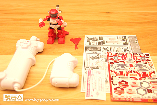 ▼ 內容一覽:機器人本體、隊伍識別用旗幟、左右手控制器一組、貼紙 以及 說明書。
