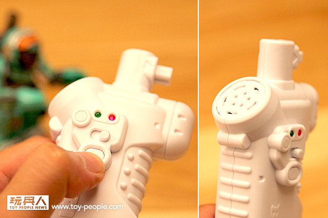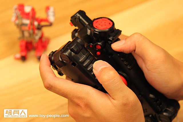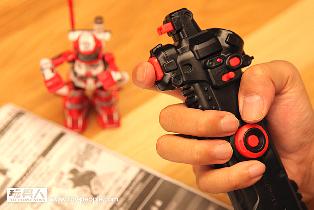 ▼ 右手有開、關、充電三個機能選擇,另有一個模式選擇的按鈕,除了戰鬥之外還能設定與無人控制的自動機器人對戰,以及超歡樂的抓鬼模式~ 此外,右手內建了喇叭,會隨著操作或競賽的過程發出音效,令戰鬥更加的熱鬧有趣!