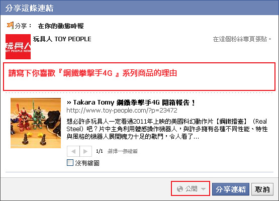 1.到本次的「Takara Tomy 鋼鐵拳擊手4G 開箱報告!」開箱報告文章按“讚”,並分享至你的塗鴉牆上,寫下你最喜歡的『鋼鐵拳擊手4G 』系列商品的理由? 記住,只寫“已分享”是鐵定不會中獎的喔!