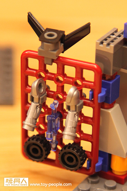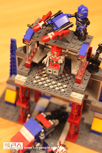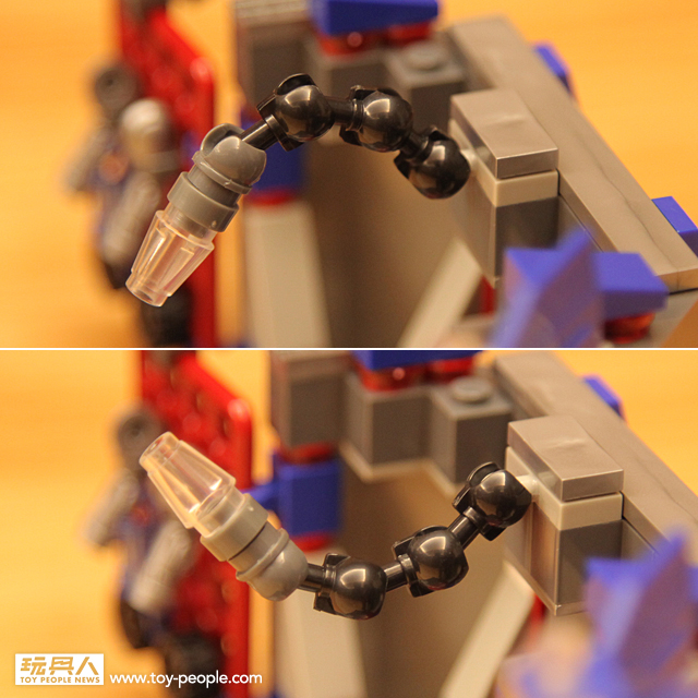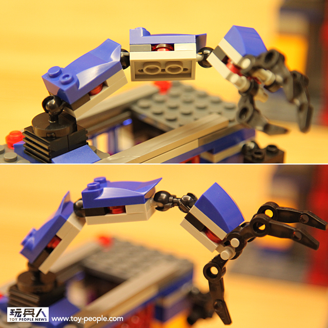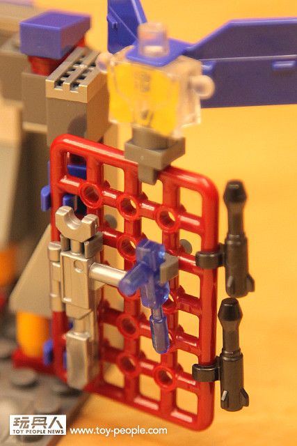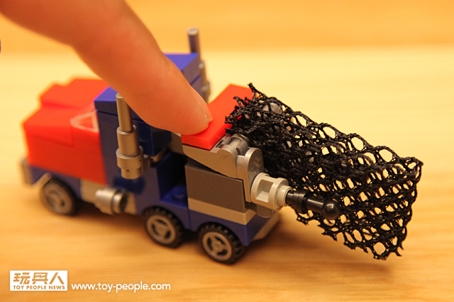▼ 柯博文裝載了一具捕捉掠獸金剛的網子,按下按鈕就可將網子發射出去。這個機關完全沒有使用彈簧,僅利用積木特性就完成了,相當巧妙的設計啊~