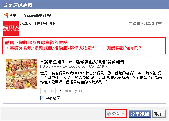 1.到『玩具人』本次的孩之寶『變形金剛“Kre-O 迷你強化人物組”開箱報告』按“讚”,並分享至你的塗鴉牆上。請寫下你對此系列最喜歡的要點(電鍍or 透明/多款武器/格納庫/迷你人物造型... )與最喜歡的角色? 記住,只寫“已分享”是鐵定不會中獎的喔!