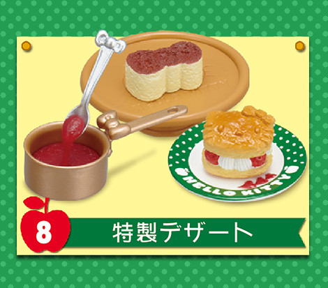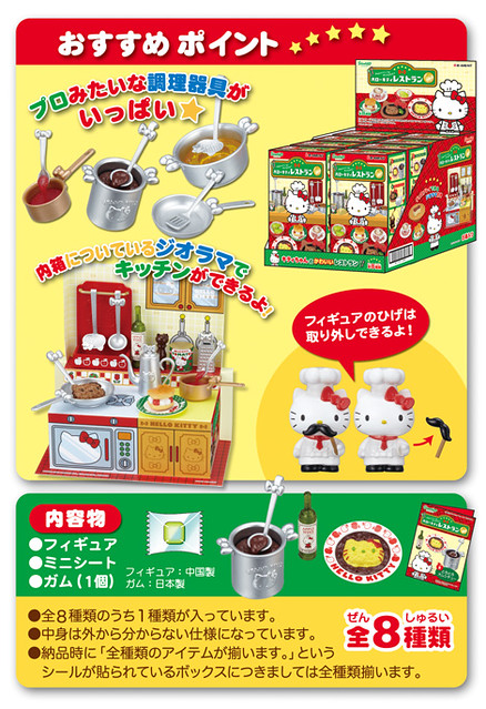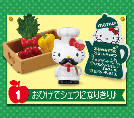 預計11月中日本將推出「凱蒂貓餐廳」食玩,收錄了漢堡排、千層派、咖啡等等可愛凱蒂貓風格美食與餐具,而且其中一款內含親自掌廚的凱蒂貓大廚,搞笑地附上假鬍子配件,難道料理高手除了帽子高就一定要有鬍子嗎?本系列一共有8款,每盒日幣399日圓,提供給各位貓迷參考!