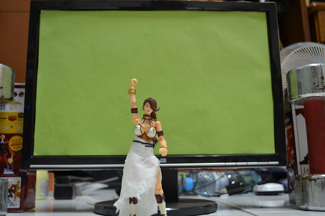 接下來是女主持人, 這支是山口式的人偶,他們的關節是齒輪式關結, 拿來觀賞很不錯,但拿來拍片超級難拍的, 因為沒法像FIGMA關節一樣可以做很細小的微調, 所以我這支只有動上半部,因為手跟頭是小關節, 但走路的話就沒法用了, 會彈會來, 很不穩, 所以在這裡就是花瓶而已。後面電腦螢幕貼綠色紙, 去背後你就可以置換你想要的影片片段上去囉.
