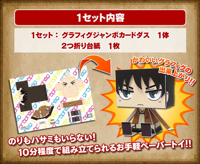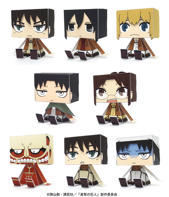 日本近年來相當流行「四角紙模公仔」。這是一種摺紙公仔,角色千變萬化,但是都有共同的四角大頭與坐姿,既可享受手作樂趣,蒐藏起來又相當輕便有成就感。在日本甚至還有專屬的投幣式販售機專門銷售,看來市場十分看好喔!graphig與萬代自從合作推出影子欄球員後,近日再推出「進擊的巨人」四角紙模。一共推出8款,其中光是里維就包辦兩款,難道人氣已經幹掉主角與巨人了嗎?每款角色高約6.5公分,日幣售價200圓,預計本月底於日本推出,提供給大家參考!