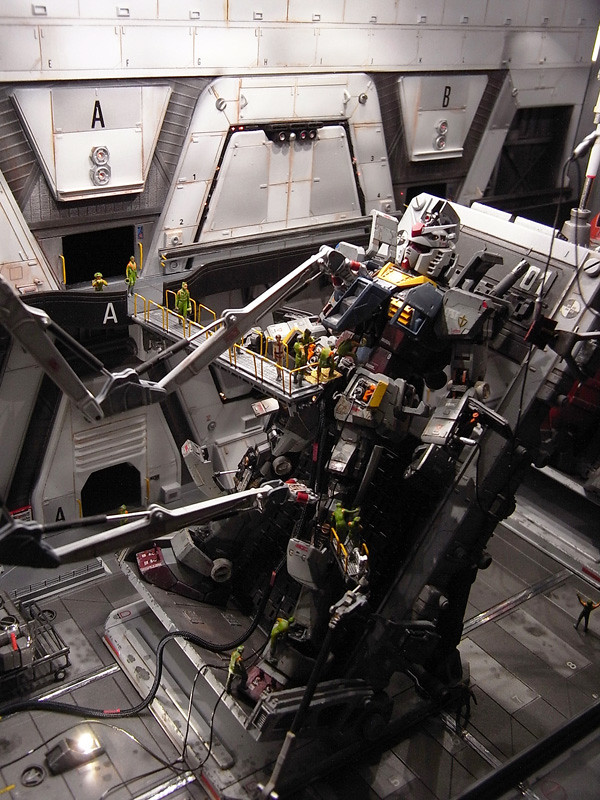 ▼ 以RG版1/144 RX-78-2鋼彈為主體改造的白色基地格納庫場景,除了背景、機械手臂和人物等細節做得栩栩如生之外,鋼彈外裝甲打開,露出內部精密複雜的機械零件,更呈現出一種無可比擬的真實感。