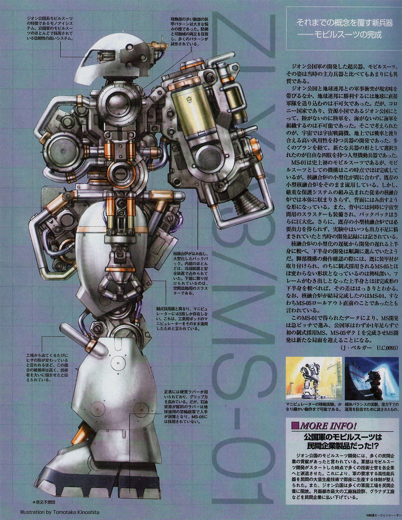 ▼ 吉翁尼克公司(ZEONIC,ジオニック)因應吉翁公國國防省提出在「米諾夫斯基粒散佈的下新型高性能兵器」的要求下,所研究開發出的巨大人型兵器ZI-XA3,最後在國防省的編訂下,改名為「MS-01」。