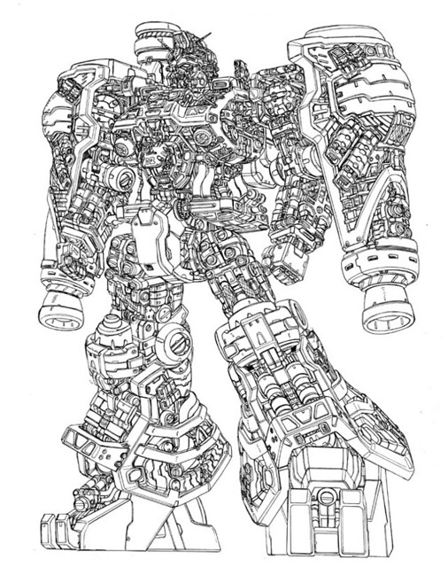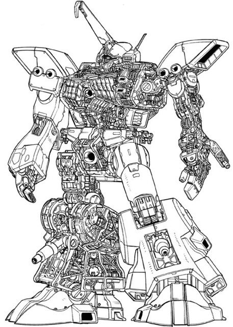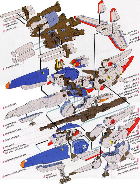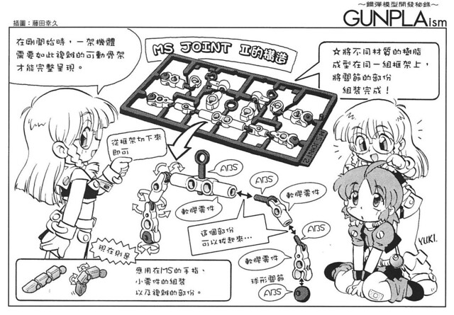 這些精密的機械內構,讓原本線條簡單的MS,突然變得複雜無比。各位讀者想像一下,在那看不見的厚重裝甲之下,有著動力源源不絕的核融合引擎在澎湃地運轉著,而像是油壓連桿、步進馬達... 等等各種連名字都叫不出來、或是名字太饒舌複雜,念到一半會咬到舌頭的機械裝置,正推動著幾十噸重鋼鐵般的超合金零件,做出像人類一樣精巧細緻的各種動作。這些不可思議的組合,正是激發無窮想像力的泉源,也是讓真正熱愛機械的熱血男兒們為之瘋狂著迷的精髓!~