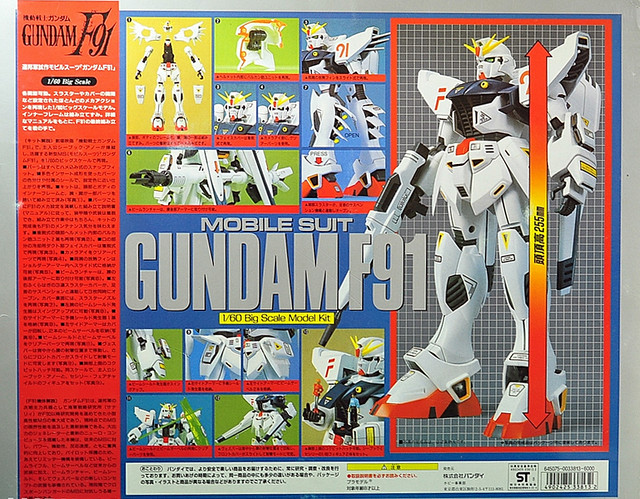 ▼ 1/60 鋼彈F91 可以看到許多複雜的機關設計,例如可開啟式的駕駛艙門、面罩、噴射器外裝甲、可展開的散熱片等等,並且還附了男、女主角西布克和賽西莉的等比例人偶。這些概念後來更進一步運用在MG 系列模型上。