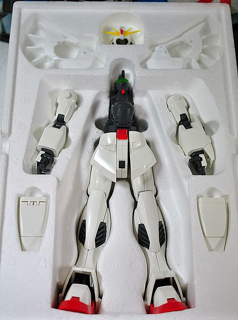 圖為1993 年9 月推出的HG 1/100 V2 鋼彈,可以看到在光之翼、腳盤和胸部等零件都是採用系統多色成型,而眼窩和胸口等難度很高的細部分色也做得相當徹底。只要上個墨線就有很高的完成度了。