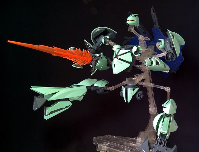 ▼ MG 1/100 RX-93 ν鋼彈Ver. Ka 的骨架中含有透明螢光綠色的精神感應框架(Psycho Frame),裂甲的設計,更能展現機構內骨架的複雜細節。