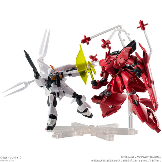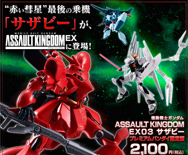 可與最新推出的ASSAULT KINGDOM第4彈連動的ASSAULT KINGDOM EX03沙薩比也隨之登場。沙薩比(サザビー)是夏亞就任新吉翁元首後,下令建造能與之新人類能力相稱的革命性MS。配備有光束戰斧、光束步槍、可發射飛彈的盾以及浮游圓錐砲,因為是首部搭載精神感應框體的MS,因此能大大發揮新人類的駕駛力量。本次獨立於ASSAULT KINGDOM第4彈外而以EX03系列登場,並且分為普通版以及限定版兩種。除了上述武裝,限定版還追加了ASSAULT KINGDOM第4彈登場的νガンダム替換配件,透過配件更換可以重現阿姆羅與夏亞的激戰場景。另外限定版還配有夢幻武器「ロングライフル」以及リ・ガズィ用BWS,在光束戰斧等配件顏色上也有些微不同。普通版售價約1620日圓、限定版僅限「プレミアムバンダイ」網站販售,日幣售價2100日圓,11月7日已經於官網開放預購,預計2014年2月出貨,提供給大家參考!