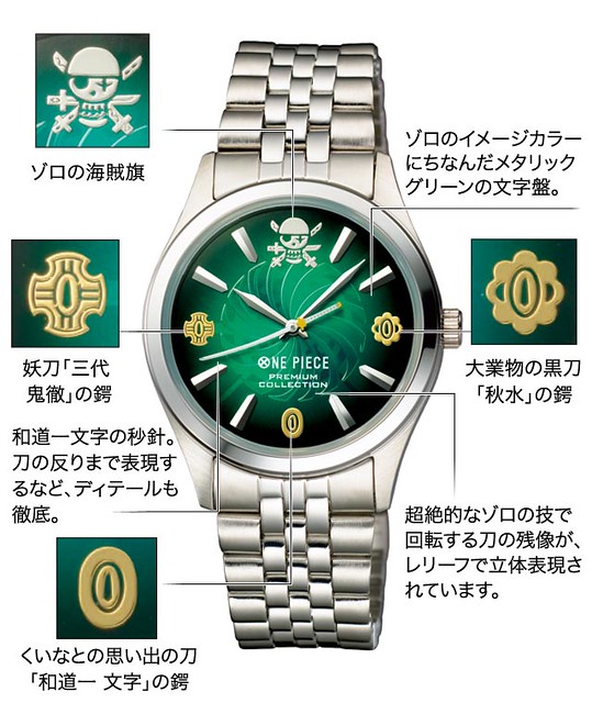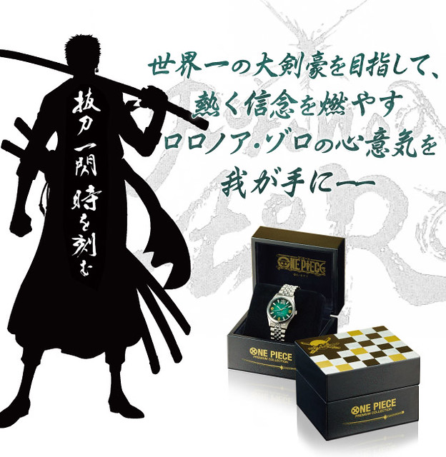 為慶祝索隆今天生日,日本手錶品牌「PREMICO」特別推出「劍豪的記憶」紀念手錶。為了表現索隆的劍豪特色,手錶上特別設計了許多創意特徵。秒針以名刀「和道一 文字」造型設計,12點、3點、6點以及9點鐘的位置裝飾著「索隆海賊旗」、「大業物的黑刀〝秋水〞之鍔」、「〝和道一 文字〞之鍔」、「第三代妖刀〝鬼徹〞之鍔」。錶面以刀的迴轉殘影為裝飾,表現索隆的迴轉刀技。