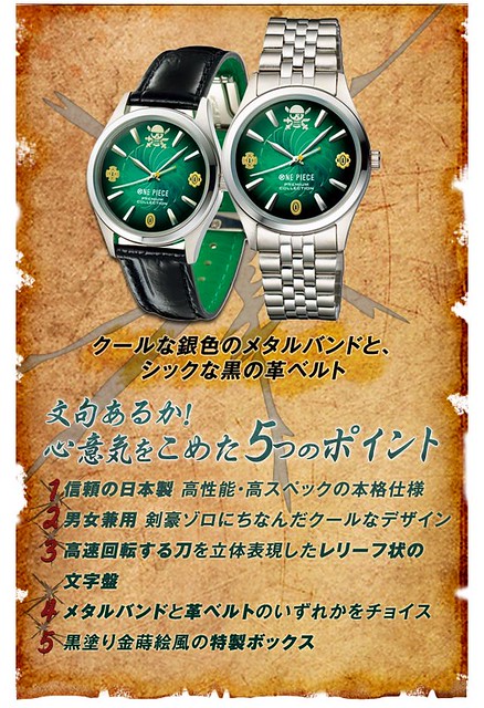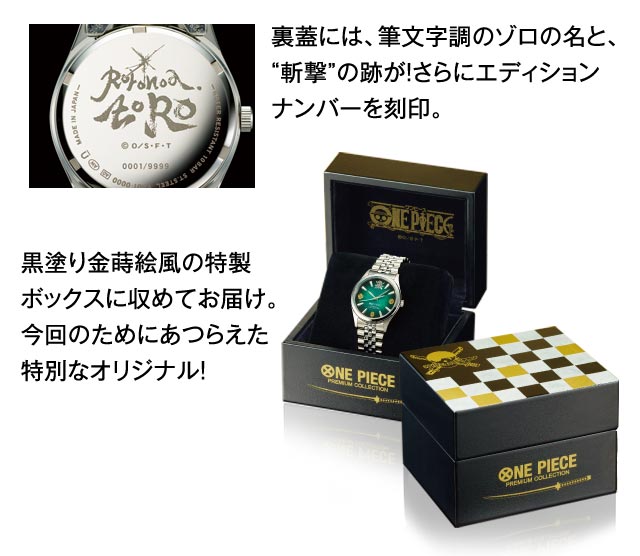 錶的背面以豪邁的書法寫出索隆的名字,並且有斬擊的痕跡裝飾以及限量9999的編號,十分精緻。錶帶則有金屬與皮革兩種可供選購,並且有蒔繪風的精緻包裝盒可供收納,整體來說設計非常有一體感,絕對是索隆迷的夢幻逸品!