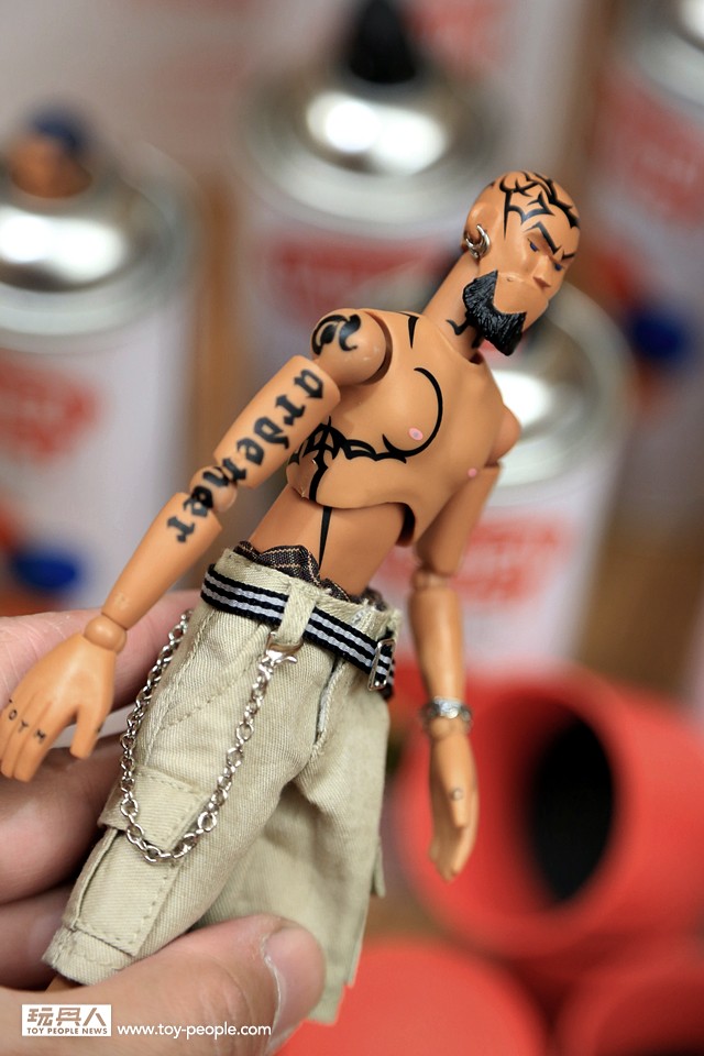▼ 人偶身上的刺青相當的清晰、漂亮,就連手指上的字也做出來。右側的胸部上有個灰點並不是塗裝的瑕疵,而是原始人偶身上就有一個喔!褲子、身上的各式金屬配件也一一到位。