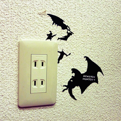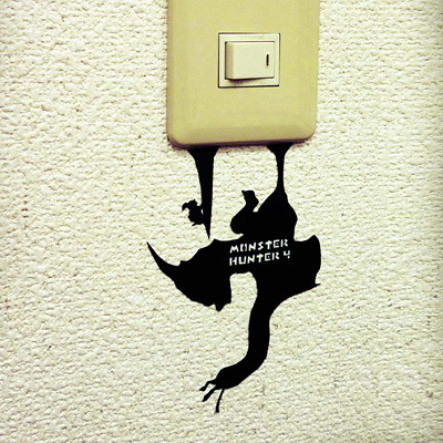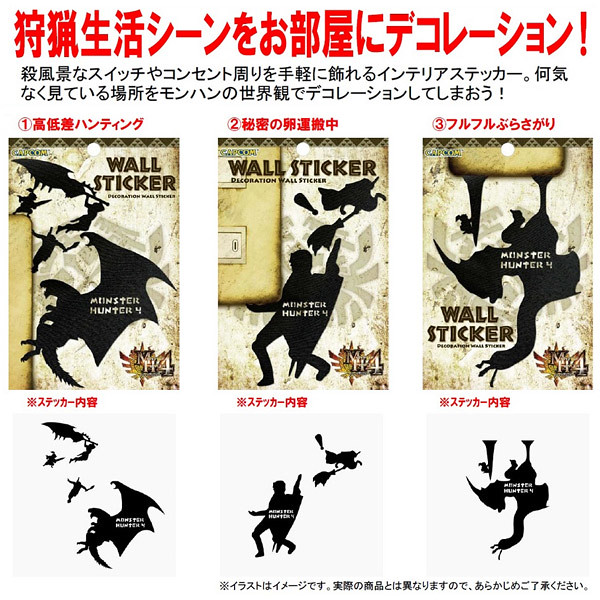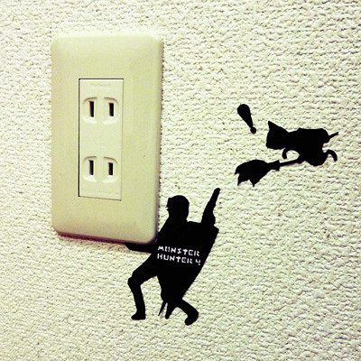 先前我們曾經為大家介紹過「進擊的巨人」裝飾貼紙。巧妙利用牆壁上插座造型,裝飾出進擊的巨人惡搞趣味。現在為您介紹的則是由卡普空所推出的魔物獵人版本。本系列作的忠實粉絲一定知道4代新導入的地形戰鬥系統,而本貼紙就利用此特色為主題設計貼紙,圖案剪影描繪正在攀爬峭壁的獵人遇到魔物襲擊,但隨行的艾路以及伙伴馬上出手相救,主題相當刺激但裝飾在牆壁上十分有趣。另外還有「秘密搬運蛋中」以及「艾路遇上晃來晃去的毒怪龍(フルフルぶらさがり)」共三種圖案。每張日幣參考售價約1050圓,預計2014年1月推出,提供大家參考!