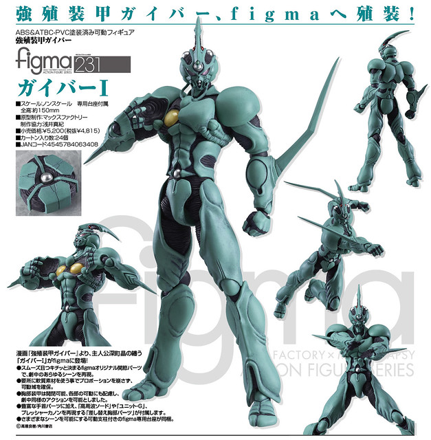 2014年12月11日新增官網宣傳照片,figma ガイバーⅠ 強殖裝甲 GUYVERⅠ 附有豐富的手首配件等等可以替換,漫畫中「高周波ソード」和「ユニット・G」等等姿勢都可以再現,前胸口可以打開裝甲呈現發射粒子炮模樣,和附有專屬台座等等配件,尺寸高約有15公分,預計在2014年12月發行,售價約5,200元日幣,喜歡強殖裝甲 GUYVER的玩具人可以參考一下歐!