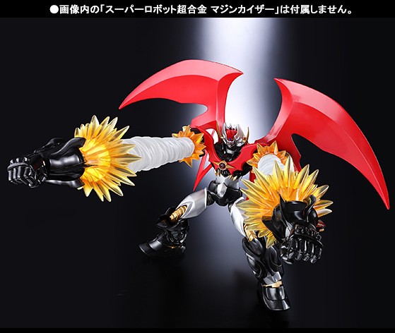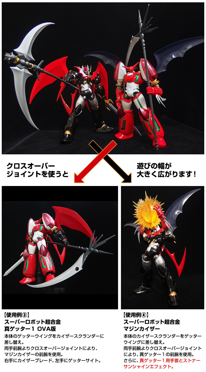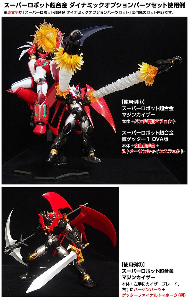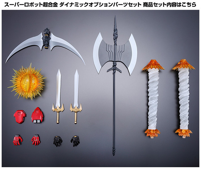 最近才上市的SR超合金無敵鐵金剛魔神皇帝凱薩,魂商店也預計在明年2014年4月推出SUPER ROBOT超合金 Dynamic Option Part Set,SUPER ROBOT超合金 裝備和特效配件組合(暫時翻譯)內容收錄了SR超合金系列產品真蓋特1號 OVA版和凱薩的武器和特效等等配件,武器等等配件都可以交換使用, 已在魂商店10月25日開始受注生産,售價約4,320元日幣,提供給喜歡SR超合金魔神凱薩和真蓋特1號 OVA版的玩具人參考。