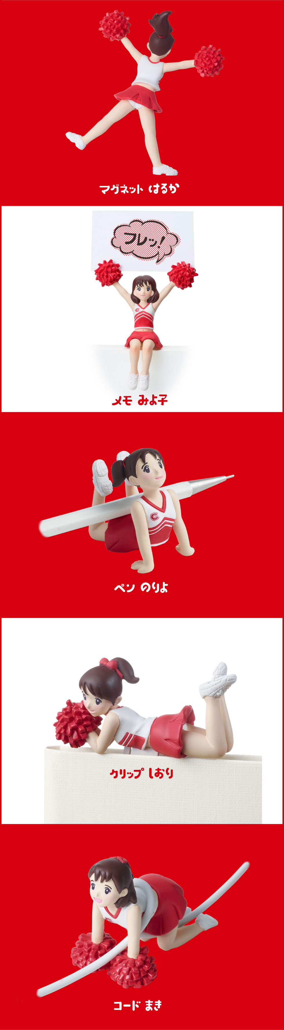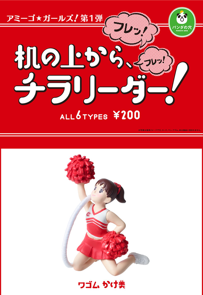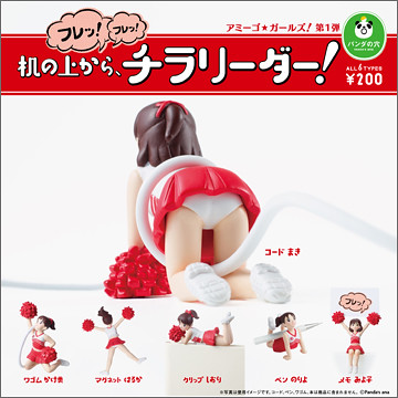 收錄多款啦啦隊女孩的迷你公仔,可以用來當文具架、整線器、磁鐵等實用功能,但更令人注目的是她們的純真曼妙外型以及怎麼都無法忽視的小褲褲,放在桌上加油打氣十分微妙。當然您也可以說它很實用,但怎麼樣都不會有人相信吧XD!!!!本商品預計12月以轉蛋形式推出,每款日幣售價200圓,提供給大家參考!