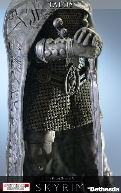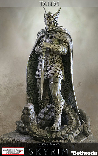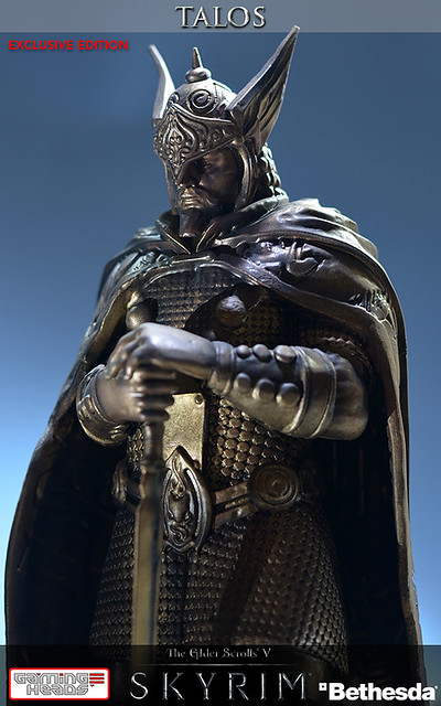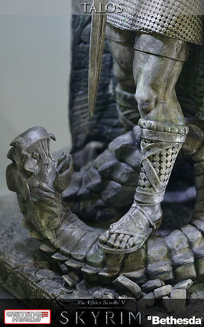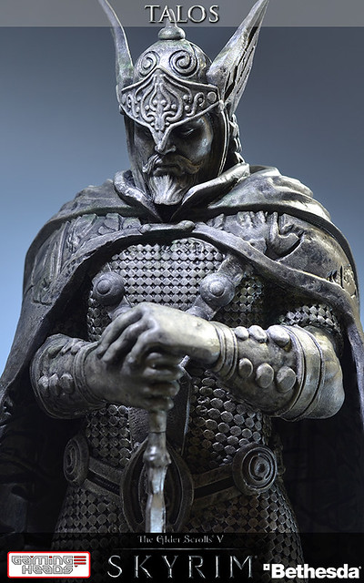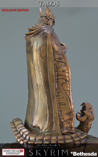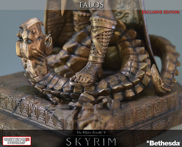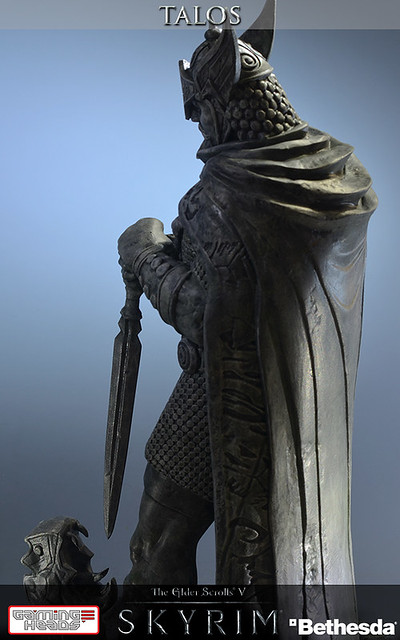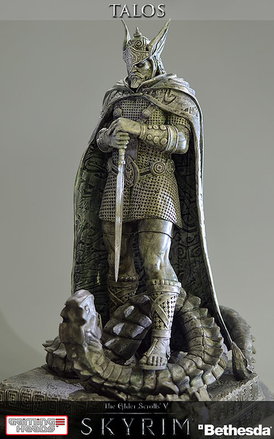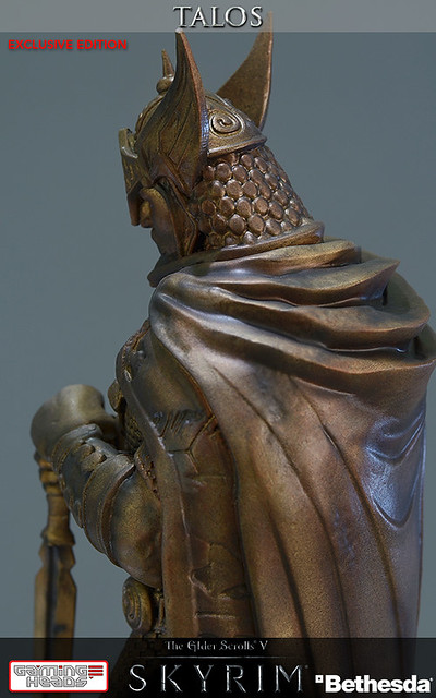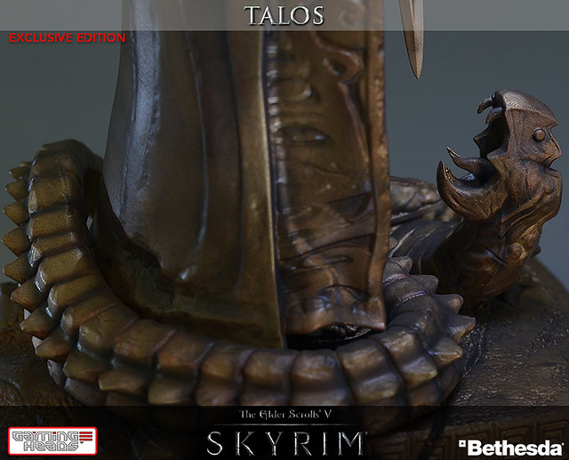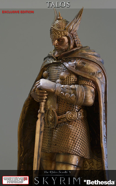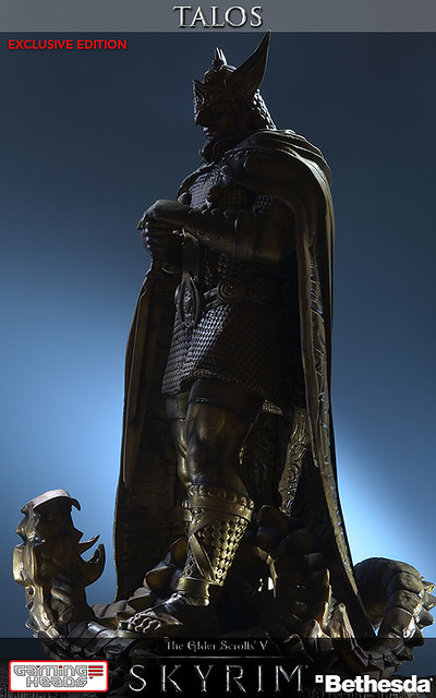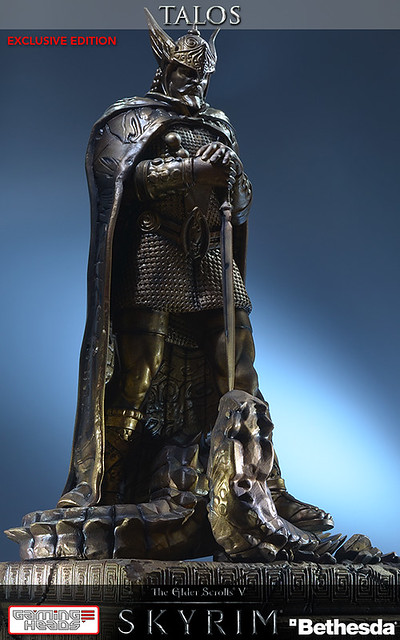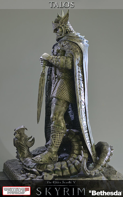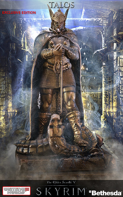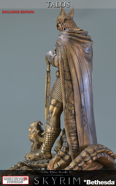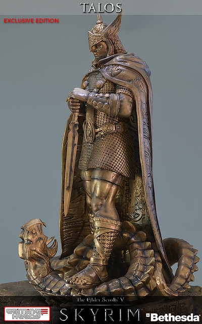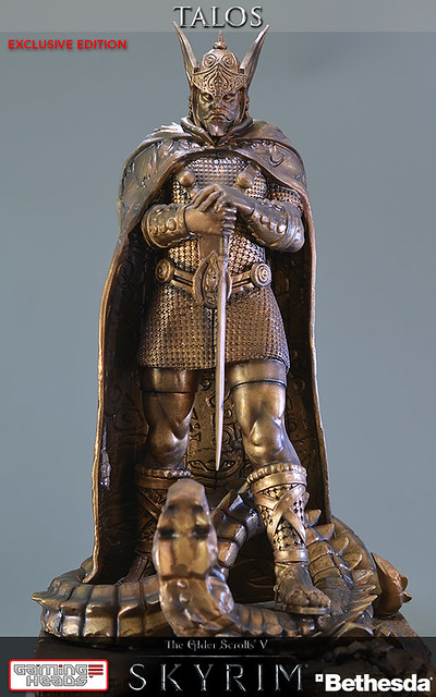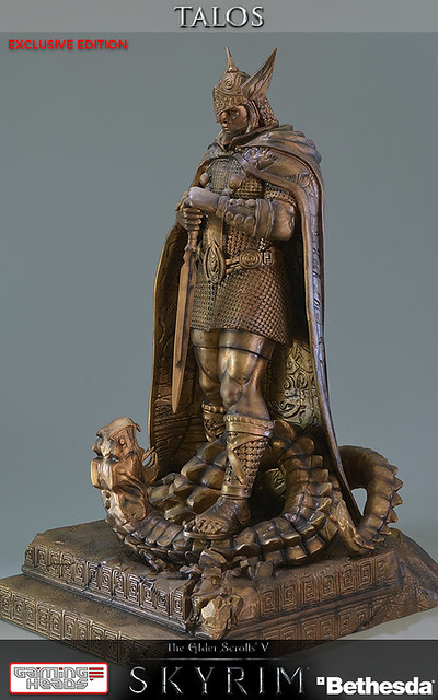 Gaming Heads針對上古捲軸V(The Elder Scrolls v)曾經推出過巨龍模型(the World Eater)以及龍裔雕像。近日又公開了限量預購的戰神塔洛斯神像(Shrine of Talos)。塔洛斯原名為Hjalti,是活躍在第二紀元的英雄。本是人類身份,但因為英勇的功績所以死後被供奉為神,後世為他建立神像並且祈求他的祝福與健康。本作品重現了遊戲中的神像造型,身著戰甲首持長劍的塔洛斯威武的踩踏在巨蛇身上,就像許多神像一樣看起來威嚴無懼、神聖不可侵犯。本作品採用手工製作相當精細,高約14英吋。分為限定版以及一般版,限定版特色是做成仿青銅質感,售價199.99美元,限量350套。一般版則是重現遊戲中的石像材質,售價179.99美元,限量750套。預購後預計2014年第2季出貨,提供給各位遊戲迷參考喔!