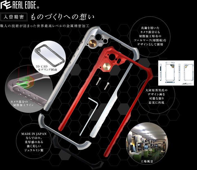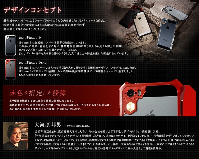 設計出「機動戰士」鋼彈聞名的日本機器人設計師「大河原邦男」,與日本電信業者“SOFT BANK” 合作,推出了iPhone 5s/5 專用的鋁合金手機殼「REAL EDGE 大河原邦男モデル for iPhone 5s/5」。這一款鋁合金手機殼,零件使用整塊鋁合金削製而成,並在鏡頭的部分採用黃銅削切面造型設計。
