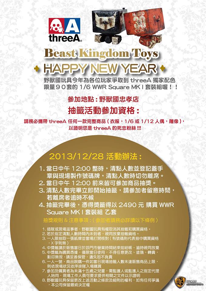 為了讓玩家們都能參與同樂,1/6 WWR Square MK I 套裝組將於12/28中午12點以抽籤方式販售,活動當天野獸國忠孝店threeA現貨產品一律八折,以感謝大家抽空參與同樂!
