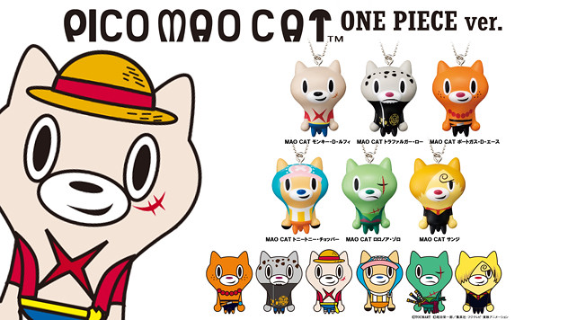 由日本知名設計師TOUMA 所設計的角色“PICO MAO CAT”與BANDAI 轉蛋事業部“ガシャポン”(Gashapon)合作,推出了一系列角色聯名的款式,最新版將推出「海賊王」聯名,並搶先於JUMP FESTA 2014(ジャンプフェスタ2014)發行!~