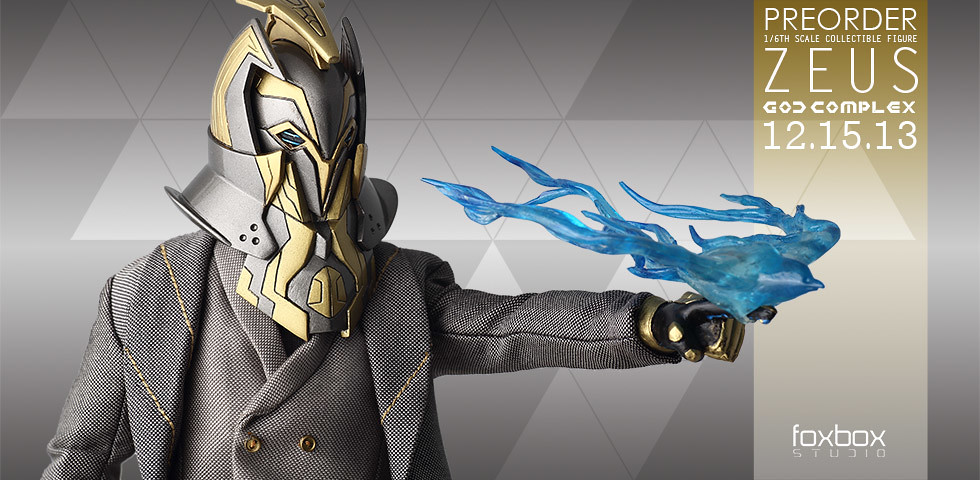 「Zeus」(宙斯)是阿瑞斯(Ares)、阿波羅(Apollo)以及雅典娜(Athena )的父親,一個至高無上掌管奧林帕斯宮殿的神。宙斯平常所使用的武器是「閃電火」(electric ball),閃電火據說是由獨眼的巨人族所打造,力量的發揮足以震懾所有的眾神。這次由Foxbox Studio 工作室的Bryan Lie 所設計推出的宙斯作品主要包括:3 對不同造型可替換的手掌以及1 個打開造型的手掌;一組「閃電火」(electric ball)與「閃電鷹」(electric eagle);一個限定的Foxbox Studio 特製展示地台。