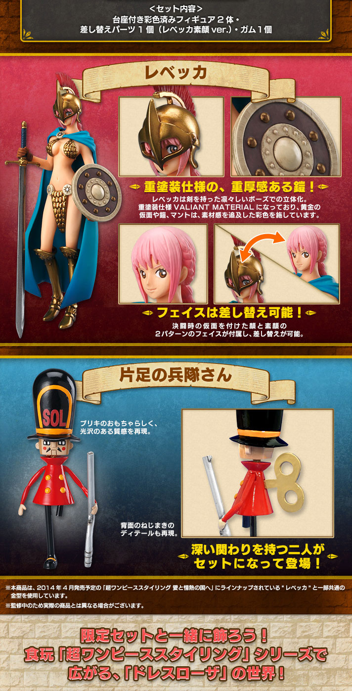 除了普通版超STYLING 「前往愛與激情之國」篇之外,海賊王 超STYLING 也同步將推出重新塗裝的限定套裝組合「蕾貝卡 & 獨腳玩具兵」(レベッカ&片足の兵隊さん)。