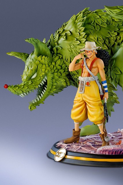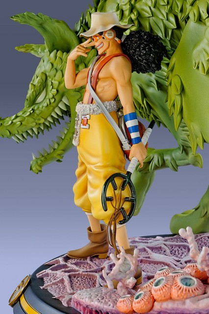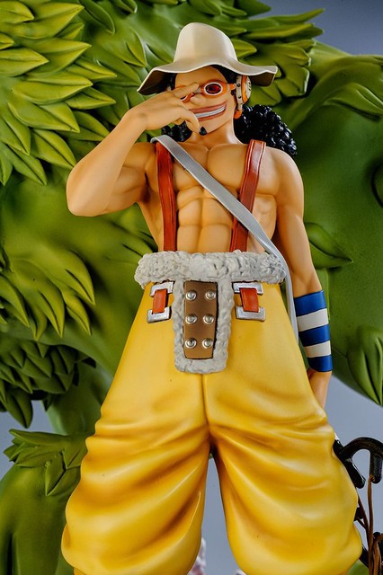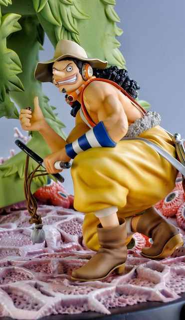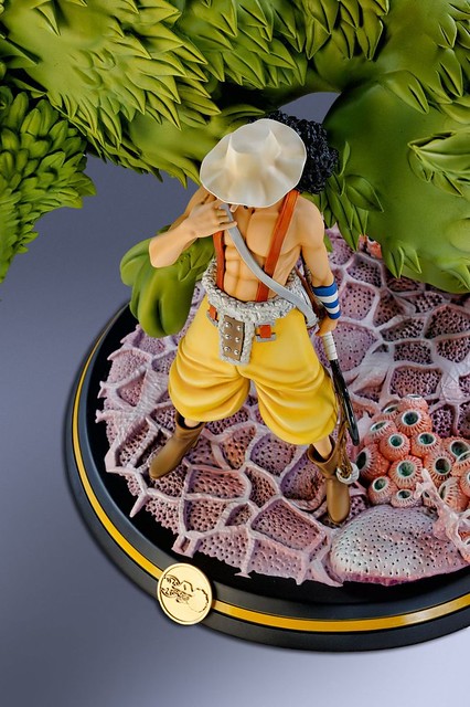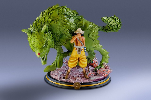 本作品從魚人島的場景地台來看是以兩年後魚人島篇為設定,跟漫畫中必殺技施展不同,本作品是讓植物巨狼伴隨身後,讓騙人布看起來相當有氣勢。另外本作品有站立與蹲下兩種騙人布可供替換,不管那個角度欣賞都相當過癮,可說是海賊迷不可錯過的夢幻逸品!