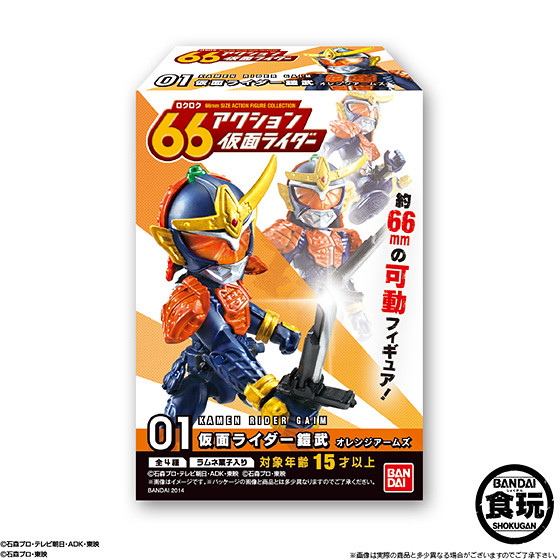 萬代預計2014年第一季將推出新玩具系列「66mm SIZE ACTION FIGURE COLLECTION」。首波推出4款假面騎士,包含了假面騎士鎧武、假面騎士Decade、假面騎士OOO以及假面騎士新一號。雖然只有6.6公分大小,但是可動關節高達14處!Q版造型也頗精緻討喜,每盒日幣參考售價399圓,提供給大家參考!