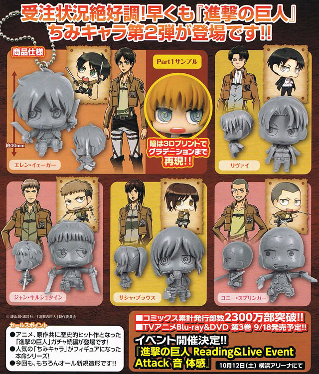 由日本玩具廠商Takara Tomy 所推出、造成大轟動的熱門商品,Q版蚊香眼造型《進擊的巨人》轉蛋,將推出第二彈!收錄了全新造型的艾倫(エレン・イェーガー)、便服模樣的里維(リヴァイ)以及新里維班成員約翰(ジャン・キルシュタイン)、莎夏(サシャ・ブラウス)還有柯尼(コニー・スプリンガー)。主要角色們全員到齊的模樣更加充實了收藏內容,絕對是粉絲不容錯過的補充系列!必入手啊~