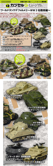 日海洋堂玩具公司主攻精緻縮小比例尺寸的盒玩和轉蛋,在去年2013年3月推出了德國坦克裝甲師團相當受到喜愛軍事小車的玩具人歡迎,這次CAPSULE Q MUSEUM 膠囊Q博物館的世界坦克博物館(World Tank Museum)系列的第二彈預計將於2014年4月推出WW2名戰車篇 第二次世界大戰名戰車篇(暫時翻譯)。
