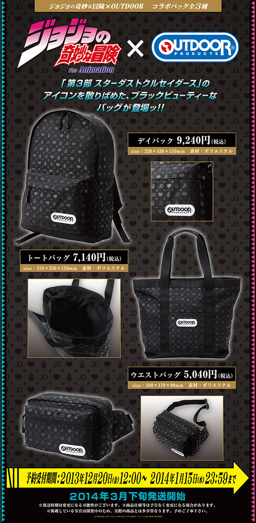 JOJO冒險野郎再次與OUTDOOR推出新款!自2013/12/20 ~2014/1/15 於p-bandai.jp開放預購。共有背包、手提包以及腰包三款新品。花紋設計採用了第三部主角空条承太郎的經典裝飾圖案(愛心、手掌與JO字樣),背包尺寸W32×H43×D15cm,日幣售價9240圓。手提包尺寸370 x 350 x 150 mm,日幣售價7140圓。腰包尺寸280 x 170 x 90 mm,日幣售價5040圓,預購後預計3月出貨,提供大家參考!
