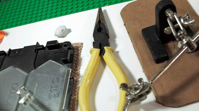這是這次我拍片用的一些工具,樂高的頭真的很緊,原本是用老虎鉗,但是老虎鉗很笨重,最後覺得尖嘴鉗比較適合。