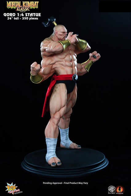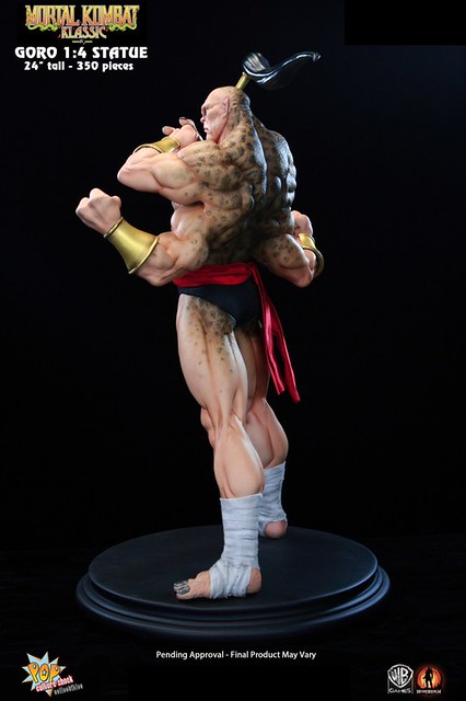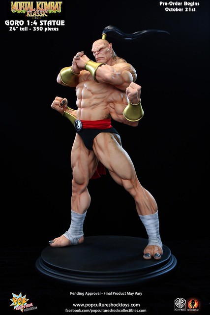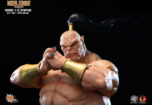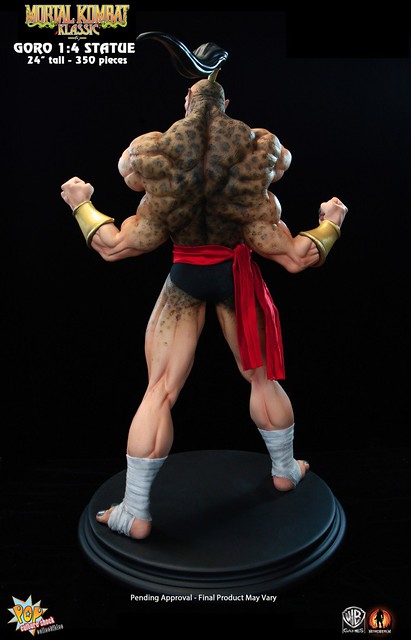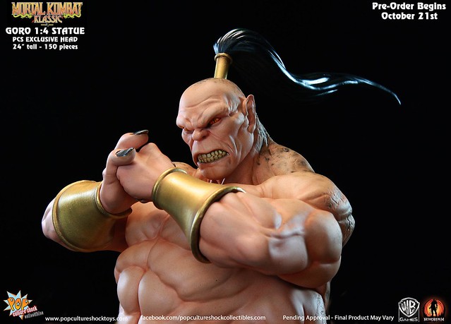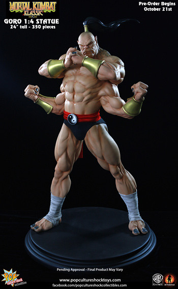 經典格鬥遊戲真人快打裡的魔王GORO曾經是虐殺過不少玩家的霸道角色,在原作中的背景設定裡GORO是2000多歲的半龍人(half human-dragon),是外世界蟬聯500年不敗的冠軍。日前Pop Culture Shock推出了他的1/4比例限量雕像,造型重現他遊戲裡的特異造型,姿態十分威猛,是真人快打迷一定會愛上的傑作,作品有分為一般版及限量版,限量版多了一款呲牙咧嘴的兇惡頭雕可供替換,不過現已完售。不介意的話一般版還有存貨可供預購喔!全球限量350尊,每尊高約61公分,美金售價450元,預購後預計6月推出,提供大家參考!