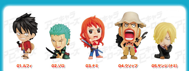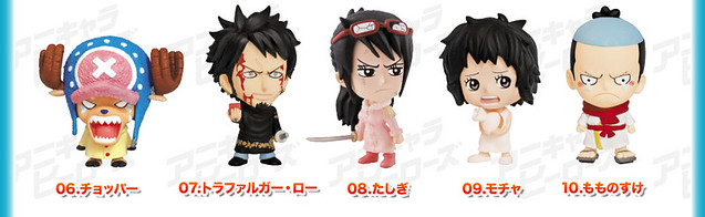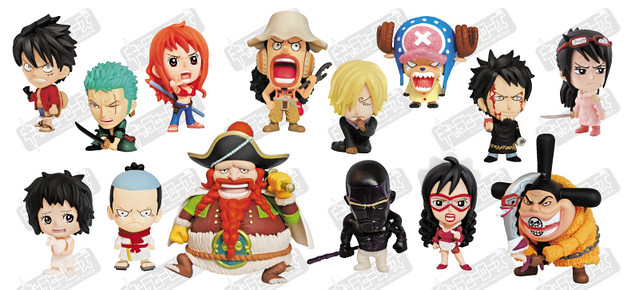 魯夫、娜美 、騙人布、香吉士(娜美)、喬巴、羅、達斯琪、莫查、桃之助、茶鬍子(合体) 、威爾可(能力Ver.)、Baby 5、巴法羅。除此之外,只要在日本網路商店karuwazaonline 訂購,就可獲得限定特典黑白塗裝“魯夫”&“羅”。