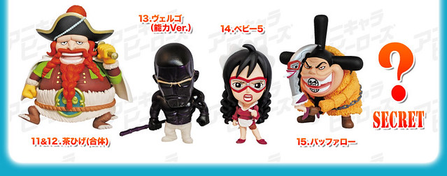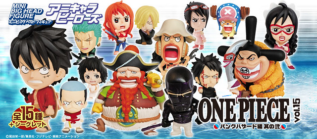 Chara Heroes(キャラヒーローズ)海賊王系列新作,第15彈~龐克哈薩特篇 其の貳~ 公開!一口氣迎向故事最高潮的尾聲,補完全部登場的角色。“草帽一夥”靈魂交換導致笑料百出的角色們追加“香吉士(娜美)”來補完,茶鬍子(A+B)組合版變成系列史上尺寸最大的角色!~ 並且還有玩具系列作首度登場的“威爾可”(能力Ver.)以及Baby 5 與巴法羅。
