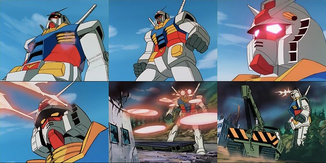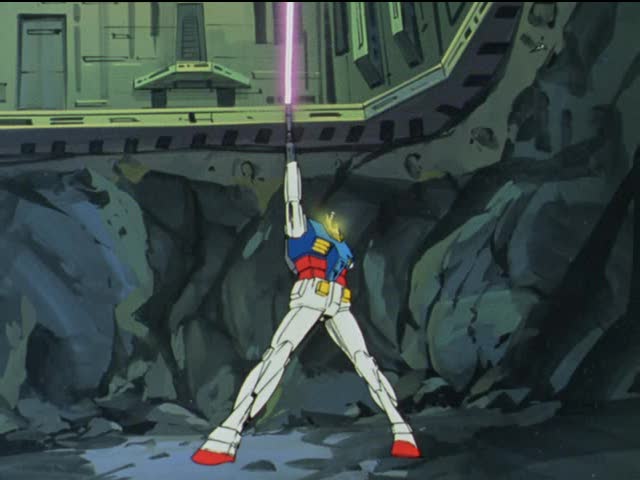▼ 電視動畫第一集“鋼彈立於大地!!”(ガンダム大地に立つ!!)中,RX-78-2 第一次登場畫面。