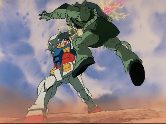 ▼ 鋼彈第一次登場就用光劍把薩克當作串燒。