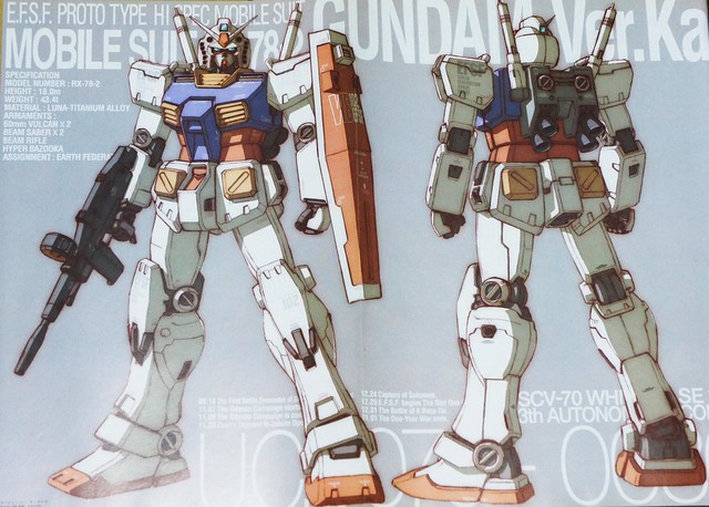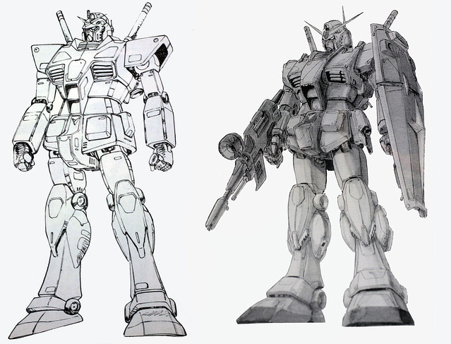第一代鋼彈動畫中,其實可以看出很多早期動畫的影子,例如主角阿姆羅,陰錯陽差地搭上了父親開發的鋼彈,這是機械人動畫的萬年老梗。而主角和伙伴們搭乘母艦「白色基地」的冒險歷程,也和「宇宙戰艦大和號」有點類似。如果看一下當年鋼彈之父大河原邦男的初期設定稿,就能略窺一二。其實,原本的設計相當花俏,不但有著像超級系機器人一般的豐富色彩,身上也多了很多無謂的線條和細節。一比之下,最終決定稿就顯得非常地俐落洗鍊,高下立判,足足鸁了好幾條街。