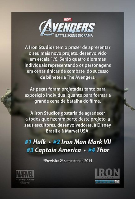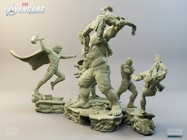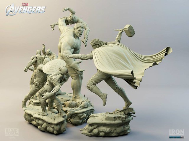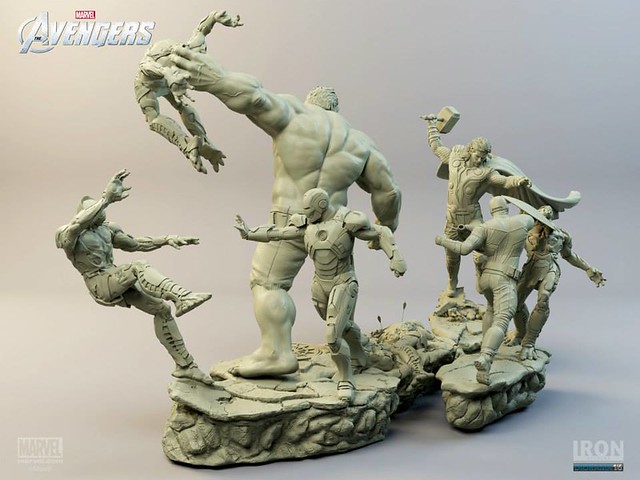 來自巴西的Iron Studios公司預計在2014年下半年推出Diorama The Avengers Battle Scene 1/6 復仇者聯盟戰鬥場景雕像(暫時翻譯)1/6版本,預計將先推出綠巨人浩克,之後是鋼鐵人馬克七、美國隊長和雷神索爾四位復仇者聯盟的成員對抗侵略地球的外星種族“奇塔瑞”(Chitauri)軍團,將以單件雕像推出,收集四位復仇者聯盟的成員雕像可以擺放在一起呈現電影經典場景,目前官網臉書先行公開了素色樣品,詳細售價和發行日期都還尚未公佈,有興趣的玩具人請持續鎖定玩具人網站後續報導。