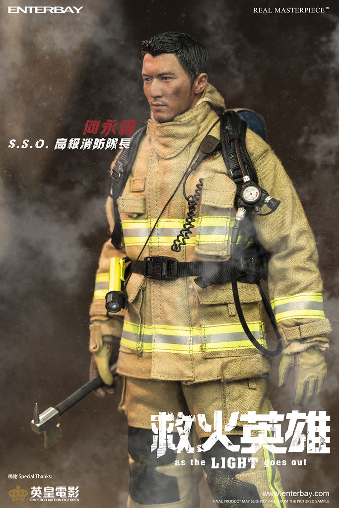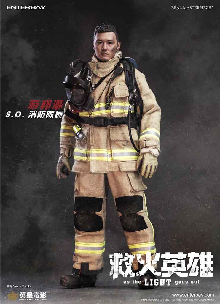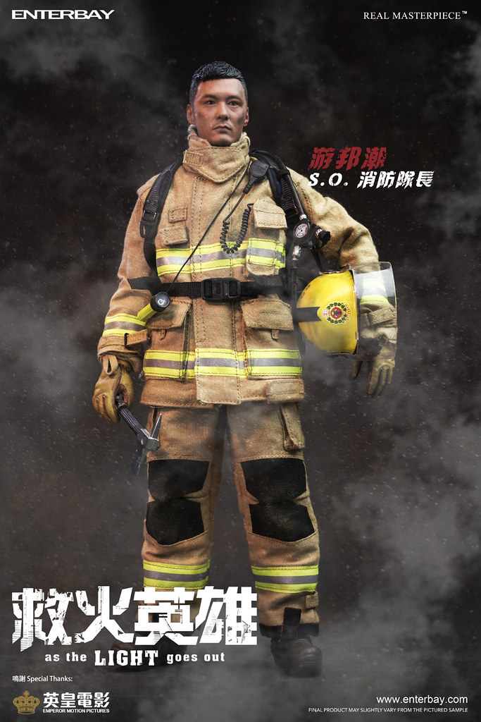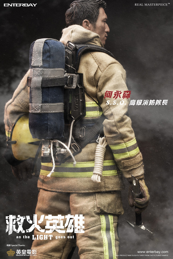 - 素體身穿ENTERBAY自家開發的EB Fire Service消防服。此防護服按真實消防服設計,包括防護頭套、防護內衣、防護外套、吊帶防護長褲。