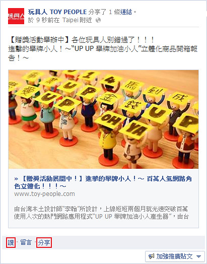 即日起只要你到『玩具人』Facebook粉絲團按“讚”,分享『“進擊的舉牌小人!~ 百萬人氣網路角色立體化!!!~ ”開箱報告』到你的塗鴉牆上,並寫下你喜歡本系列作品的原因,就有10 名幸運的玩具人可獲得5款隨機款式的“UP UP 舉牌加油小人”!