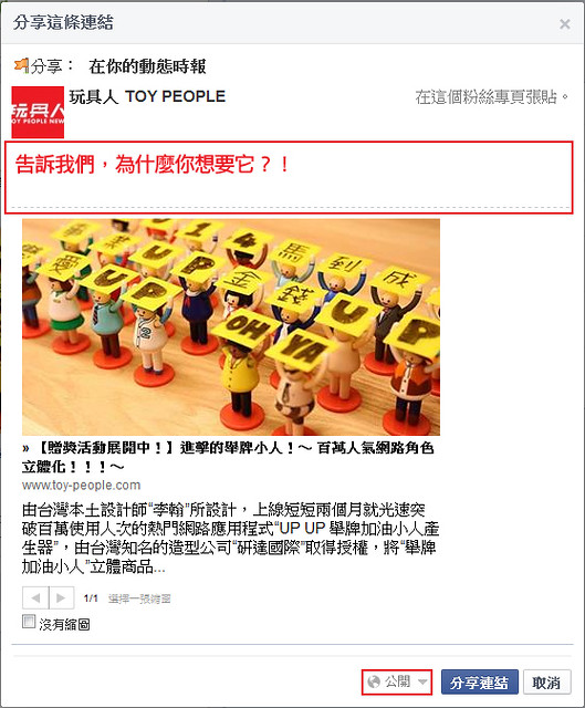 1.到『玩具人』本次的『“進擊的舉牌小人!~ 百萬人氣網路角色立體化!!!~”開箱報告』按“讚”,並分享至你的塗鴉牆上。分享內容請寫下喜歡本系列作品的原因?