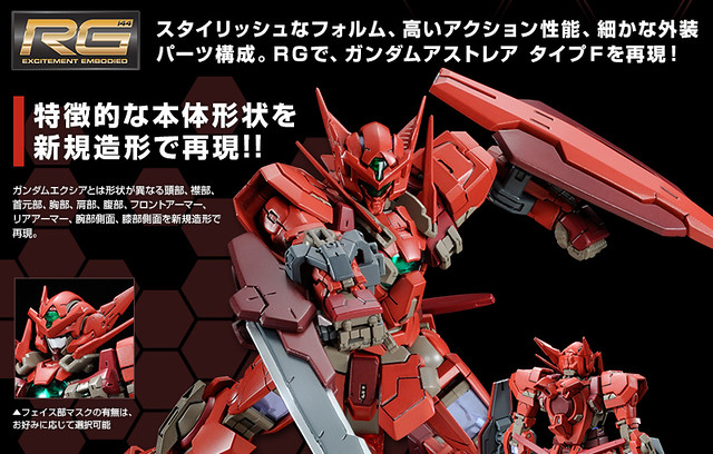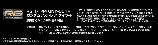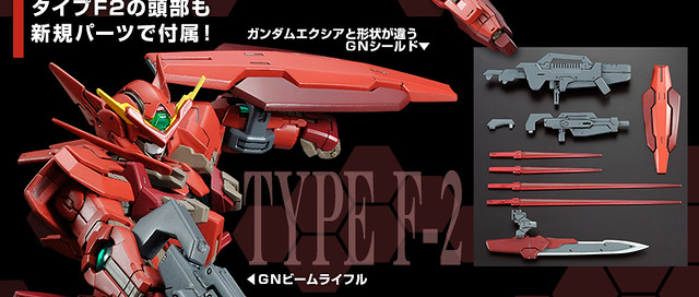 為了能夠忠實呈現原作造型,全身採用了大量的新規造型零件,除此之外,可藉由零件的變化來切換F型(TYPE-F)或F型改(TYPE-F 2)。搭配了許多以RG 為基準的武裝,包含了:GN 砲(GNランチャー)、原型GN 劍(プロトGNソード)、GN 光束步槍(GNビームライフル)、GN 盾牌(GNシールド)。除此之外,也可對應HG 系列所使用的武裝。