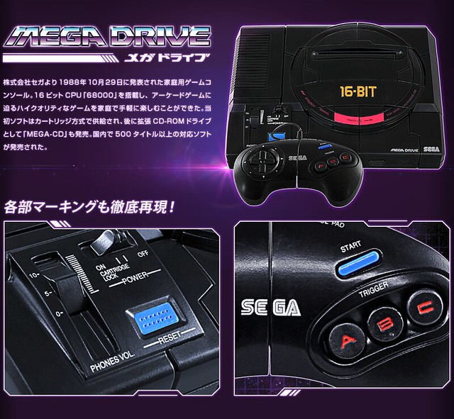 SEGA Mega Drive 簡稱MD,在台灣又被稱為SEGA 或世嘉五代,美國稱為Genesis。這是日本電玩公司SEGA 在1988年所推出的16位元家用電玩遊樂器,在美國甫一推出就與NIKE、Levi's 並列為年輕人最喜愛的品牌。SEGA 曾推出許多家喻戶曉的經典電玩作品,如《音速小子》、《夢幻模擬戰》、《光明與黑暗》、《戰斧》...等膾炙人口的遊戲。