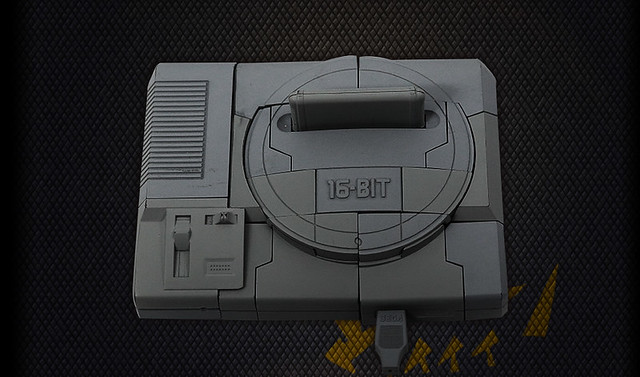 這次的作品將這一款經典主機與變形金剛結合,同時兩者有著巧妙的相近名字“Mega Drive”與“Megatron”,可將主機變形為變形金剛的超級反派「密卡登」,同時保留黑色主機的線條,以及經典的金色立體“16-bit”(16位元)字樣。這絕對會是讓經歷過SEGA世代的玩具人瘋狂的絕佳聯名!